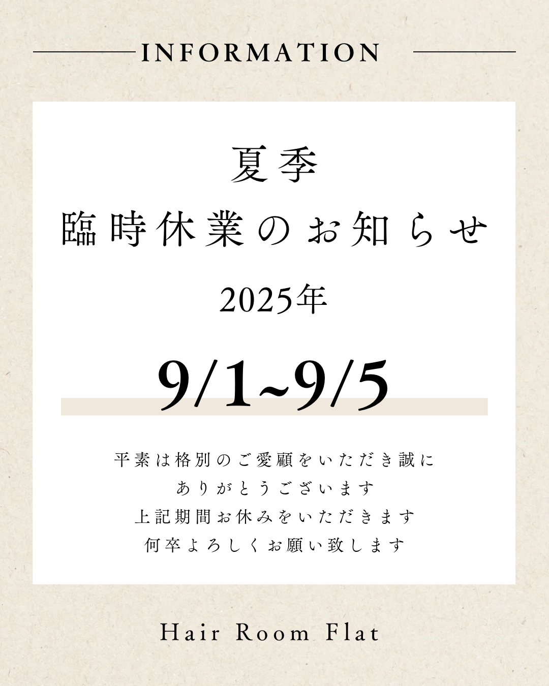 いつもヘアルームフラットへご来店頂いている皆様へ夏季休暇のお知らせです☆