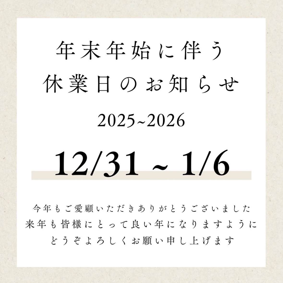 年末年始は、12月31日(水)~1月6日(火)までお休みをいただきます。