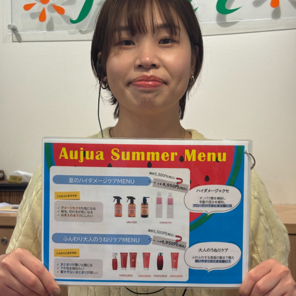 キャンペーン第二弾は オージュアトリートメント!! それぞれお客様のお悩みに合わせて選ぶ夏のスペシャルケア☆ 通常価格5,500円(税込)のところ10%offの4,950円(税込)でご提供させて頂きます! 一律価格となっておりますのでお好きな種類をお選びくださいませ♪ 【髪と地肌のWケア】 ・エイジングスパ(シャンプー)&オーセナム(トリートメント)の炭酸泡で頭皮の汚れやべたつき、臭いを除去して健康な頭皮へ導きます。 オススメの人 ・地肌の匂いが気になる ・地肌がべたつく ・シャンプーの泡立ちが悪い ・頭皮の黄ぐすみが気になる(髪の毛が変化してきた ぱさつ 【ハイダメージケア】 ・ご好評いただいているのウルティア♡で髪が必要な水分を維持しやすく、髪の毛が絡まりにくい強い髪へ導きます。 ・Aujuaのインメトリィを贅沢に使っているので髪の内部から働きかけ、強い髪の癖も改善していきます☆ オススメの人 ・髪が絡まりやすい ・髪がパサつきにより軽くなった気がする ・髪を触ってもどこがダメージしているのかわからない方 【ふんわり大人のうねりケア】 ・年齢によって変化してきた髪へ直接アプローチすることができます。 ・髪の毛のパサつきトップの髪がパラパラする髪のおさまりを良くし潤いを髪の中に閉じ込めます☆ ・Aujuaのなかでもしっとりおさまりやすいアクアヴィアとシルエットを整えてくれるタイムサージを使って髪質を改善していきます。 ・アクアヴィアがしっとりでタイムサージが少し軽めの仕上がりなので軽くもなく重たすぎない仕上がりになります☆ オススメの人 ・髪の毛のシルエットが気になる方(髪の表面がポワポワする) ・梅雨に髪の毛が膨張してうねりやすい ・髪を濡らしたときにすぐにお水が浸透しにくくなった気がする(水がはじきやすくなった) ・髪の毛に変化を感じる 沢山の方にAujuaをお試しいただき髪や頭皮の変化を感じていただけたらと思います☆ Aujuaは継続して使うことにより髪質改善が期待できる大人気メニューですのでこの機会に是非お試しください!