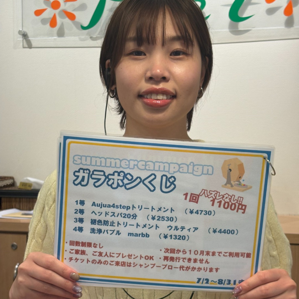 キャンペーン第三弾は ハズレなしのガラポンくじ!! 1回1100円で当たるのはなんと…!!! 1等 Aujua4stepトリートメント(通常4730円) 2等 ヘッドスパ20分(通常2530円) 3等 退色防止ウルティアトリートメント(通常4400円) 4等 洗浄バブル marbb(通常1320円) 超豪華ラインナップになっております☆ 【注意事項】 ・回数制限なし ・ご家族、ご友人にプレゼントOK ・次回から10月末までご利用可能。 ・期限を過ぎると利用不可 ・再発行無し ・チケットのみのご来店はシャンプーブロー代がかかります。
